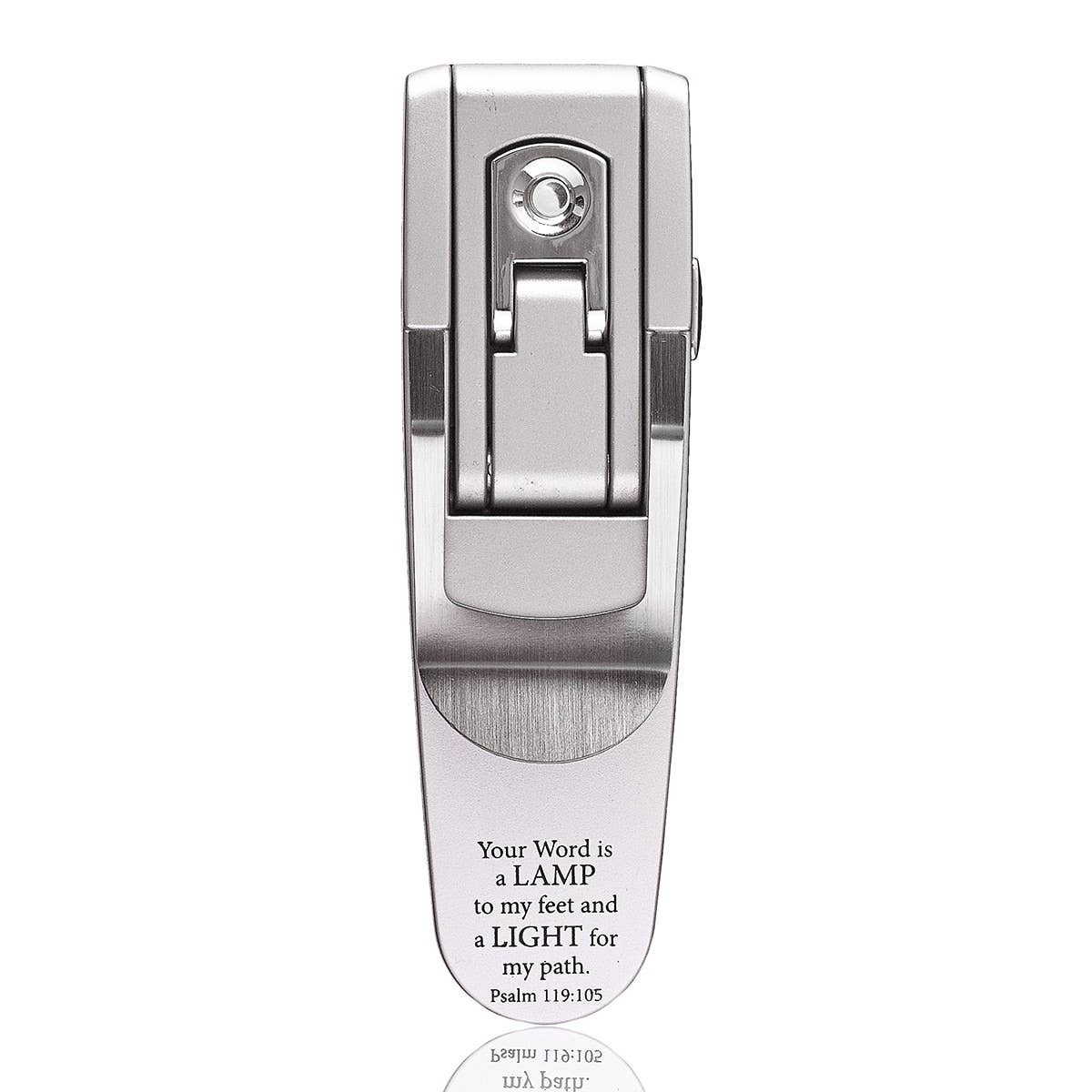 Silver hydraulic book light, Silver polymer, Black screen-printed text, Your light is a lamp to my feet and a light to my path., Psalm 119:105, Silver metal clip, Adjustable, Clip-on light, Automatic, Brilliant bright LED, Compact size, Durable, Lightweight, Batteries included, Blister pack packaging, Size: 4.8" x 1.5" x 0.8", (122 x 38 x 20mm)