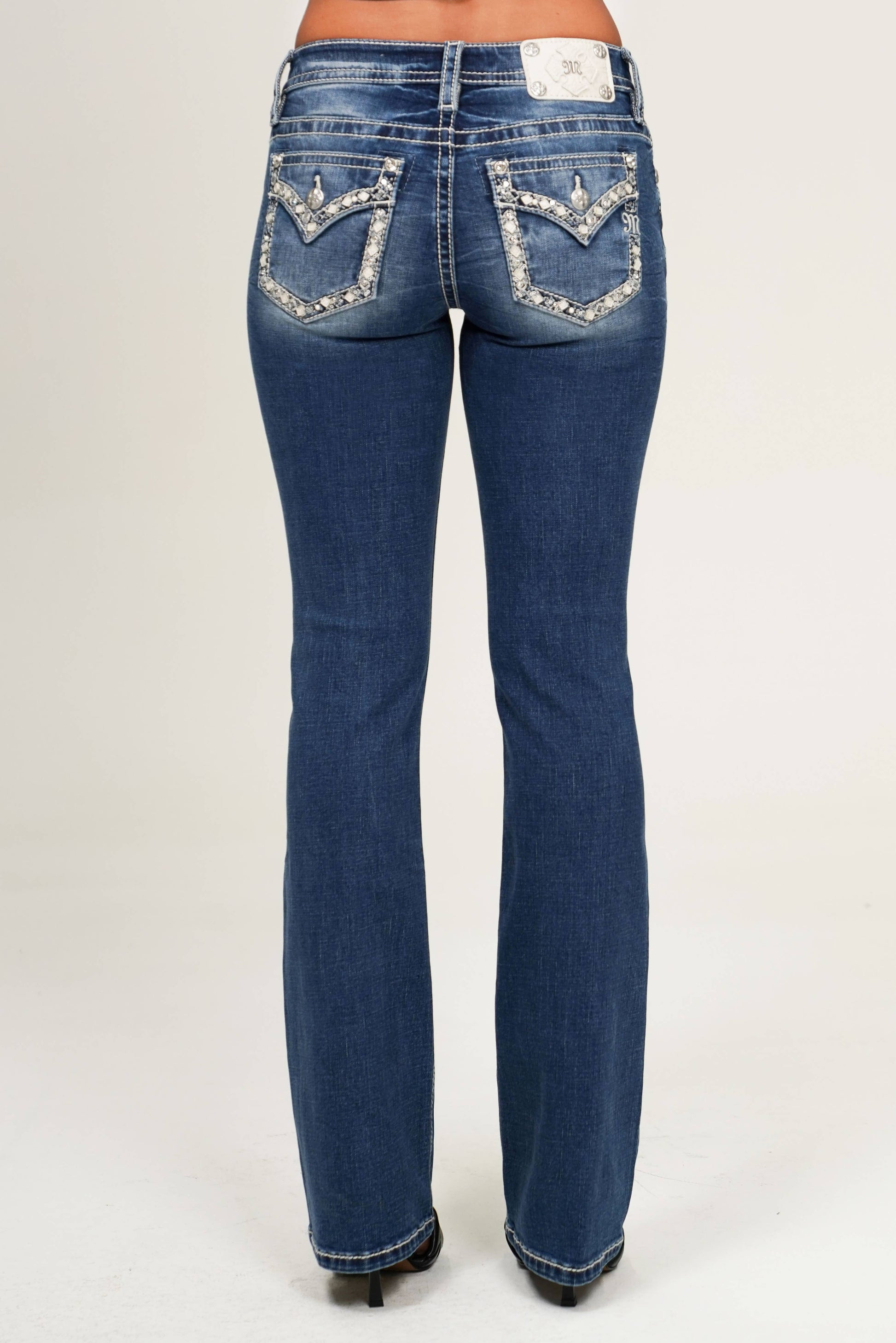 Step into effortless style with these mid-rise bootcut jeans that hit just right at 30". The medium blue wash brings that perfect worn-in vibe, while the back pockets feature a fun faux flap with an embroidered patterned border—a playful detail that sets them apart. Versatile enough for everyday wear, polished enough for nights out. Your new denim staple awaits.