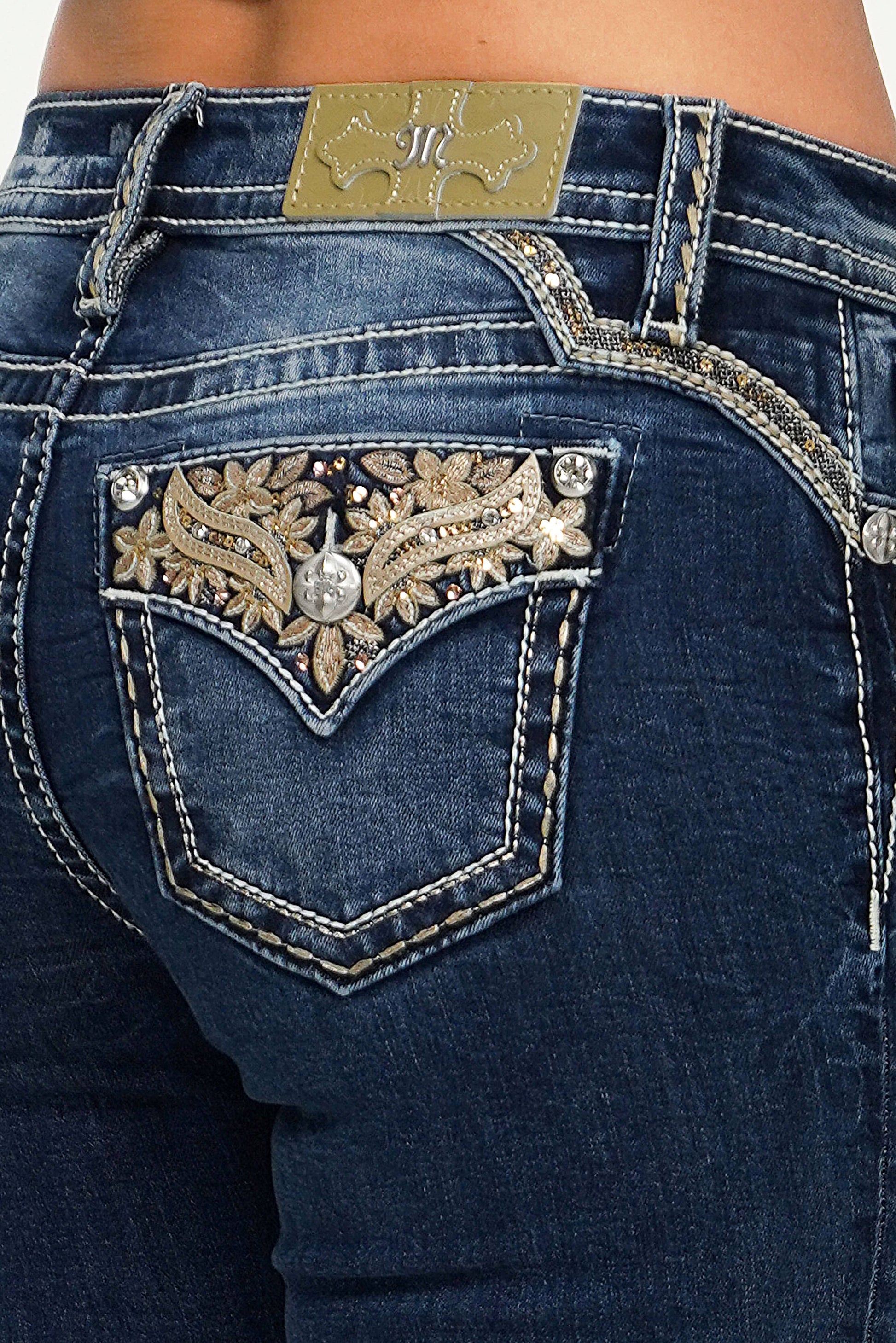 Elevate your denim game with these Miss Me Mid Rise Skinny Jeans in a gorgeous dark blue wash. Designed with a flattering 29" inseam, they hug your curves in all the right places. The standout feature? An eye-catching embellished floral design on the back pocket's faux flap—because who says functional details can't be fabulous? Perfect for dressing up or down, these jeans bring a touch of personality to your everyday rotation.