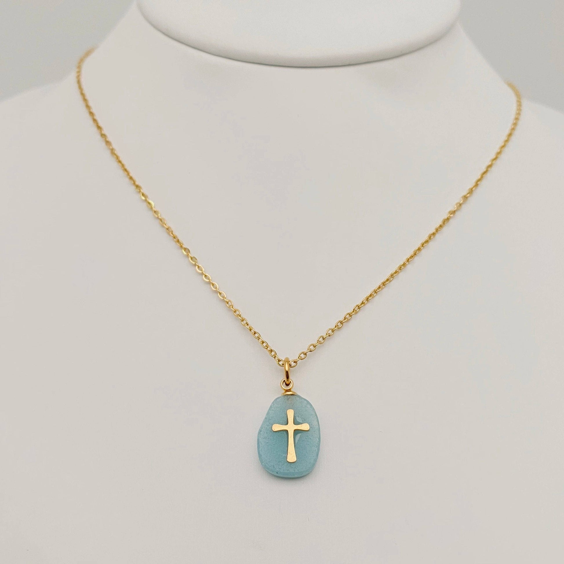 Natural Stone Stainless Steel Cross Pendant Necklace - CS: 4# turquoise blue