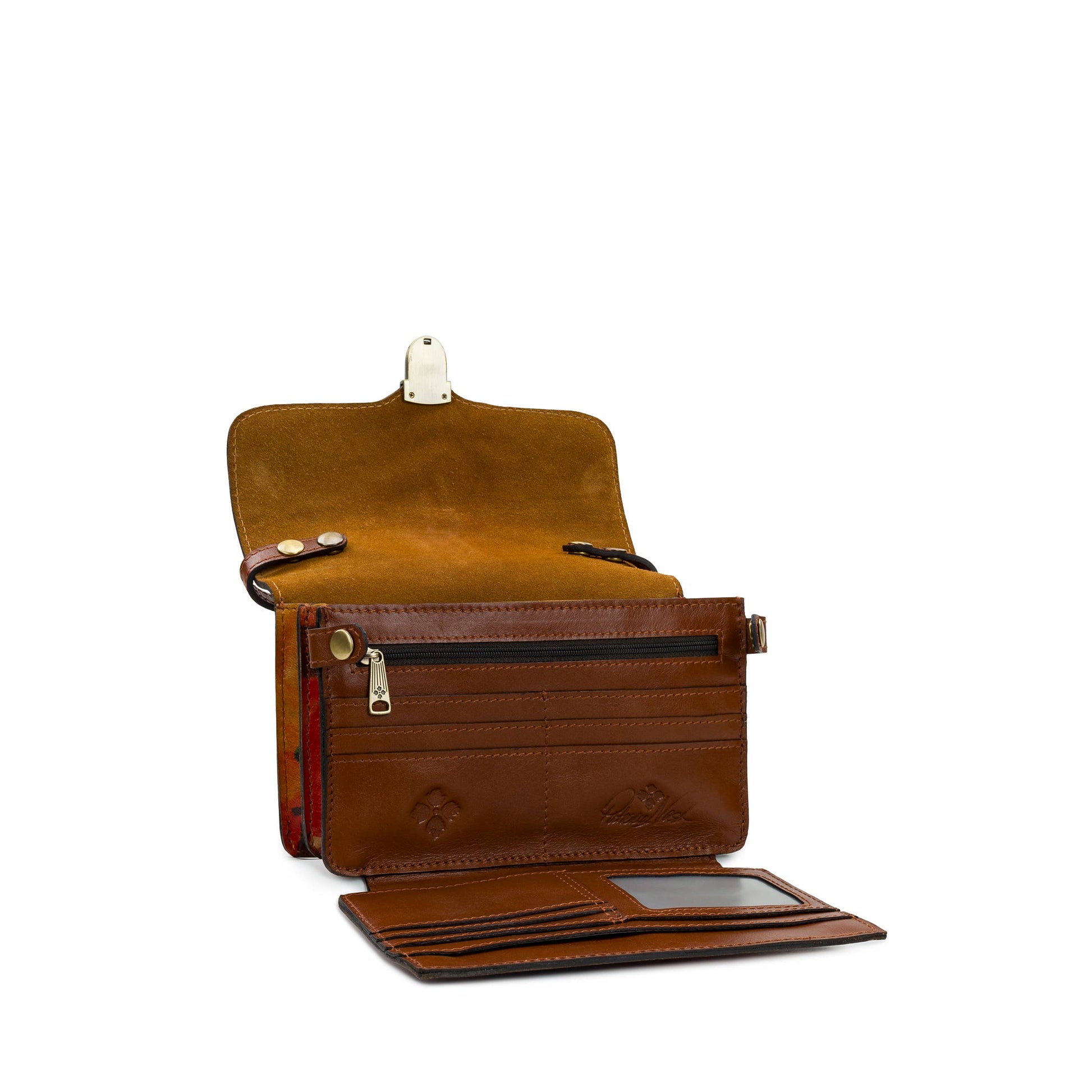 Exterior: 1 front snap compartment with 9 credit card slots, ID window, 1 zip pocket, 1 rear slip pocket with magnetic closure, braid detailing, burned edge finish