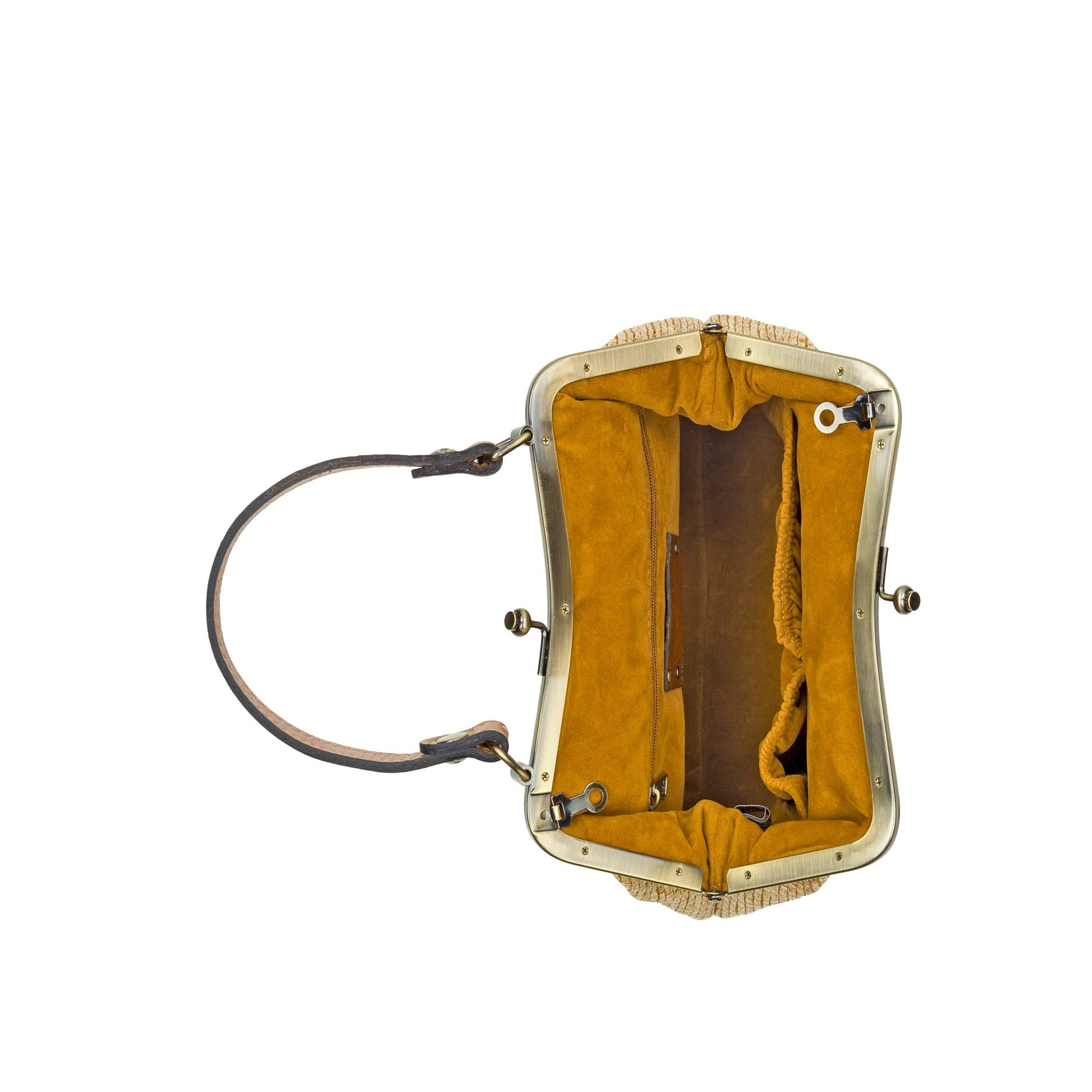 Signature brushed brass hardware, heavy handcrafted stitching