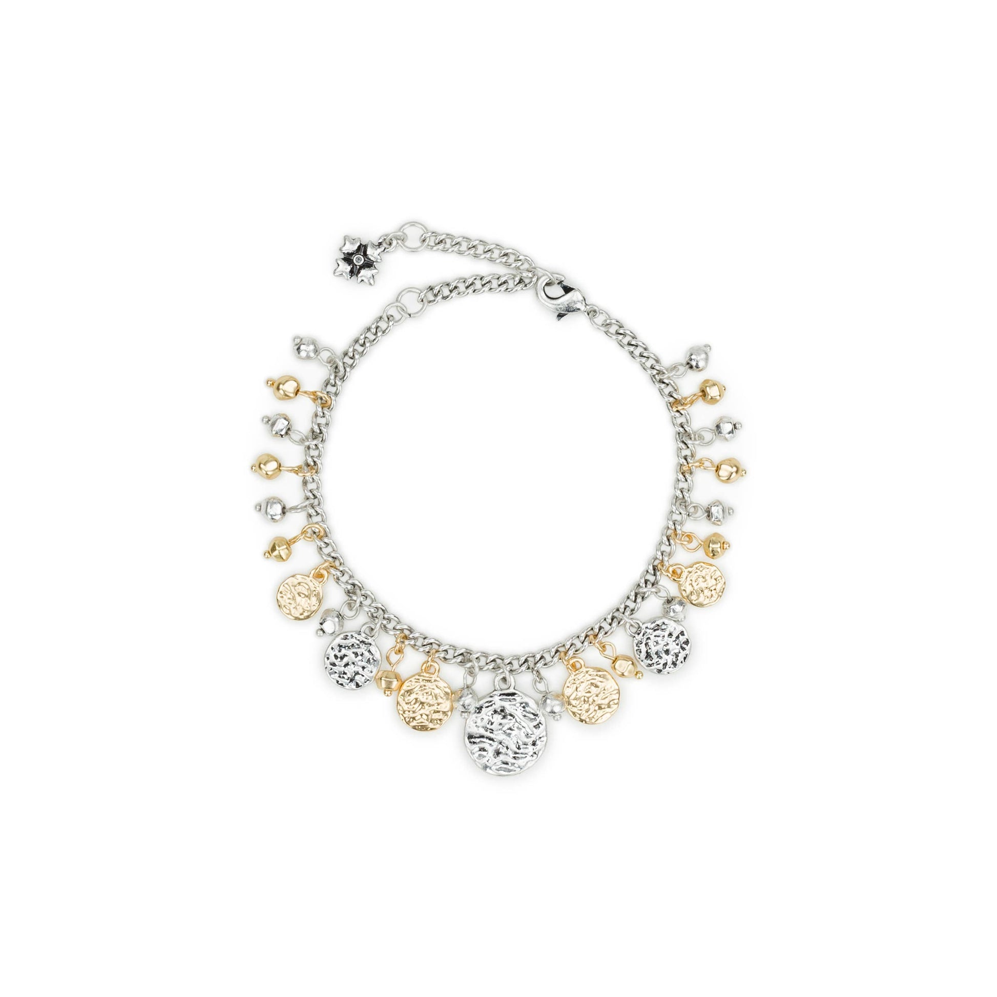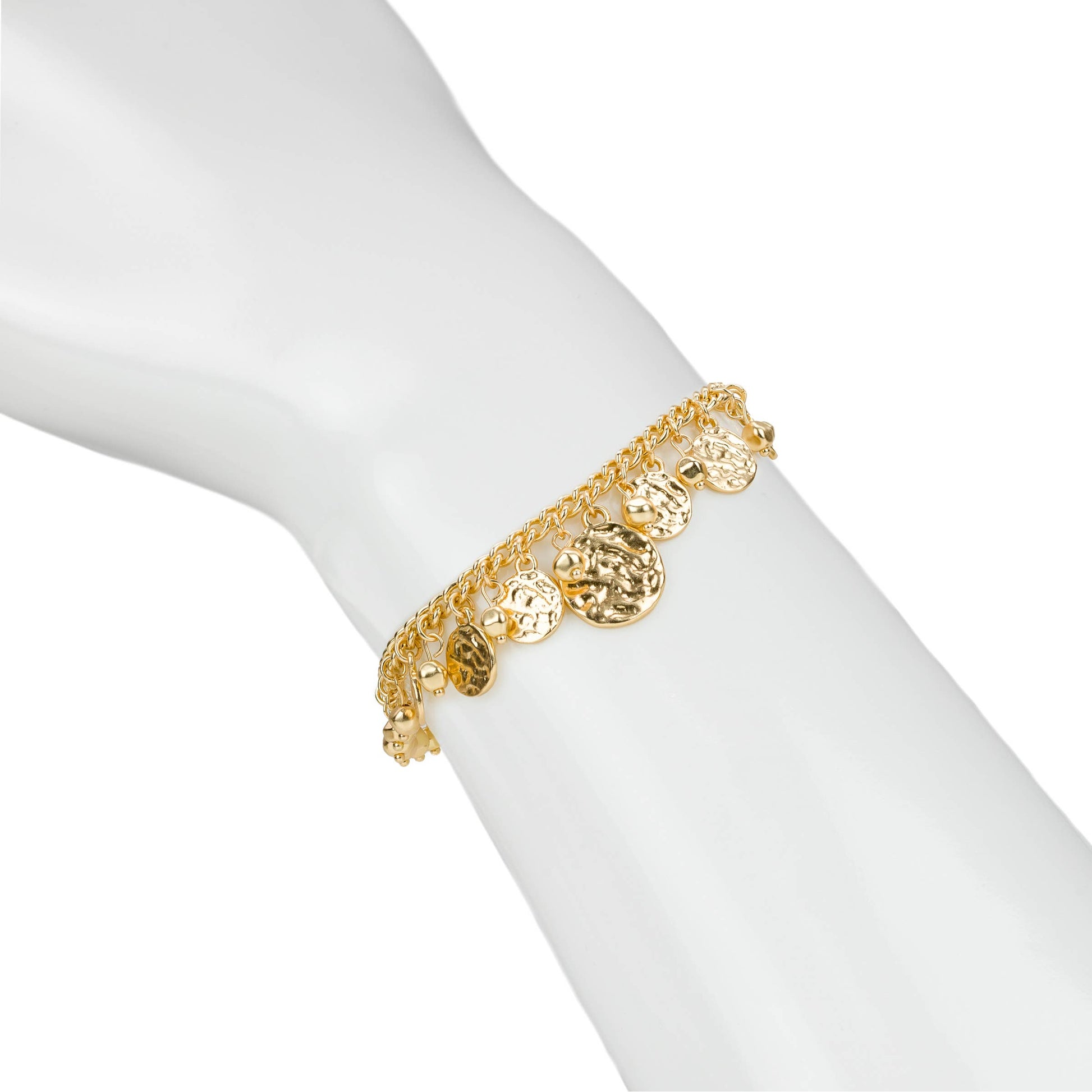 Bold yet beautifully understated, this multi-discs hammered metal bracelet brings texture, shine, and a touch of modern edge to your jewelry collection. Each disc is crafted with a hammered finish that catches the light in all the right ways, creating a dynamic, shimmering effect with every move you make. The layered arrangement of metal discs gives the piece a striking silhouette, while the sleek design keeps it effortlessly wearable, from day-to-night looks to special occasions.